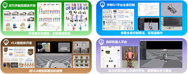 具身智能小组聚焦机器人精细操作与人机交互,研究方向涵盖灵巧手操控、全身运动控制与智能体建模,主要开展四项工作:① 灵巧手触觉模块。开发高分辨率触觉传感器,实现手部精细感知与稳定抓取;② 宇树 G1 平台全身控制。部署全身控制算法,提升运动稳定性与远程操控能力;③ VLA 智能体。构建基于大语言模型的视觉-语言-动作智能体,应用于机械臂,实现自然交互与智能操作;④ 自研机器人平台。搭建自主软硬件平台,结合强化学习探索多模态感知与决策优化。小组致力于从感知、控制、学习多层面提升机器人的稳定性、实时性与泛化能力。